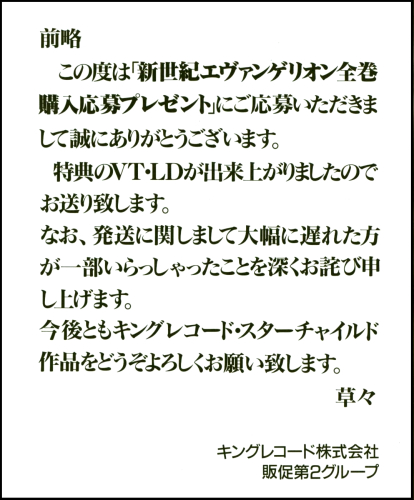 for those who sent in proofs-of-purchase of Genesis 0:1 ~ 0:14 and is the only one to contain the OA versions of Episodes 21-24. Includes a "Thank You" letter from King Records' 2nd Promotional Group.